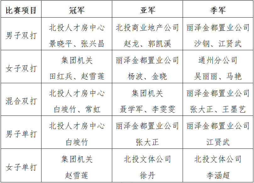 北投人才房中心景曉平、張興昌,北投商業(yè)地產(chǎn)公司趙龍、郭凱溪,麗澤金都置業(yè)公司沙鋼、江賢武鏖戰(zhàn)群雄,分別獲得男子雙打前三名;集團(tuán)機(jī)關(guān)田紅兵、趙雪蓮,麗澤金都置業(yè)公司楊波、金曉,通州分公司吳麗麗、馬艷也毫不示弱一路過關(guān)斬將,取得女子雙打一、二、三等獎(jiǎng);在混合雙打比賽中,北投人才房中心白竣竹、常虹,集團(tuán)機(jī)關(guān)聶學(xué)軍、李雯雯,麗澤金都置業(yè)公司張大正、王墨藝靚出風(fēng)格,賽出氣勢(shì),分別奪得前三名;在男單、女單的比賽中,各參賽選手紛紛拿出看家本領(lǐng),使出渾身解數(shù),展現(xiàn)個(gè)人實(shí)力與魅力,男單前三名分別是北投人才房中心白竣竹,麗澤金都置業(yè)公司張大正、江賢武,女單前三名分別是集團(tuán)機(jī)關(guān)趙雪蓮,北投文體公司徐丹、李涵超。本次比賽還設(shè)置了團(tuán)體獎(jiǎng),根據(jù)各參賽隊(duì)的比賽積分,北投人才房中心獲得團(tuán)體冠軍、麗澤金都置業(yè)公司獲得團(tuán)體亞軍、集團(tuán)機(jī)關(guān)獲得團(tuán)體季軍。