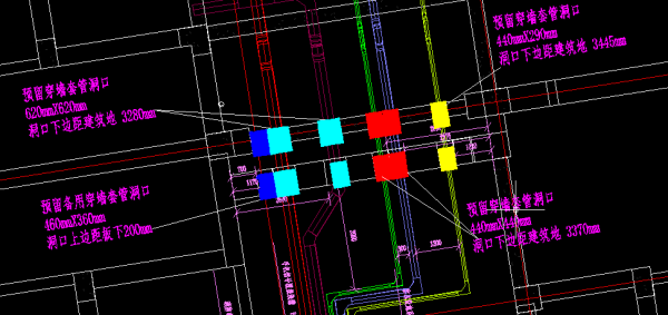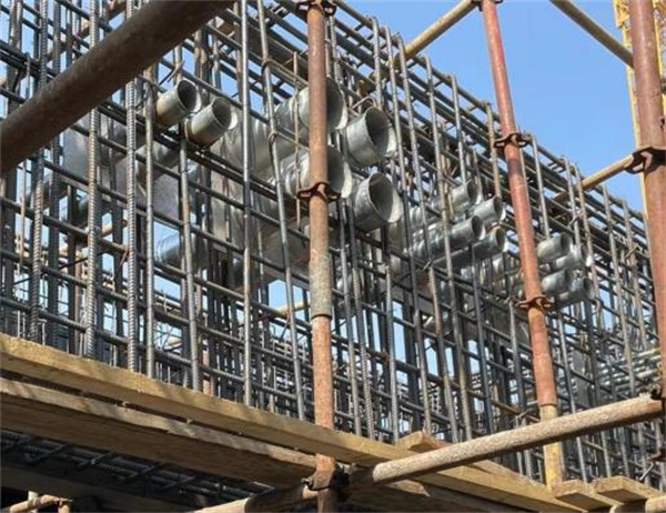 (4)機(jī)電預(yù)埋:項(xiàng)目人防區(qū)域兼做車庫應(yīng)用,一次結(jié)構(gòu)的預(yù)埋管件數(shù)量及種類繁多,在機(jī)電管線深化的起始階段,針對(duì)各專業(yè)圖紙進(jìn)行全面識(shí)圖,結(jié)合施工規(guī)范,對(duì)預(yù)埋套管的具體加工尺寸進(jìn)行統(tǒng)計(jì)。應(yīng)用BIM技術(shù)在管綜基礎(chǔ)上進(jìn)行預(yù)埋套管的模擬排布,其中強(qiáng)弱電預(yù)埋套管的大部分皆穿越人防門頂部,在此處需進(jìn)行精準(zhǔn)深化預(yù)埋。